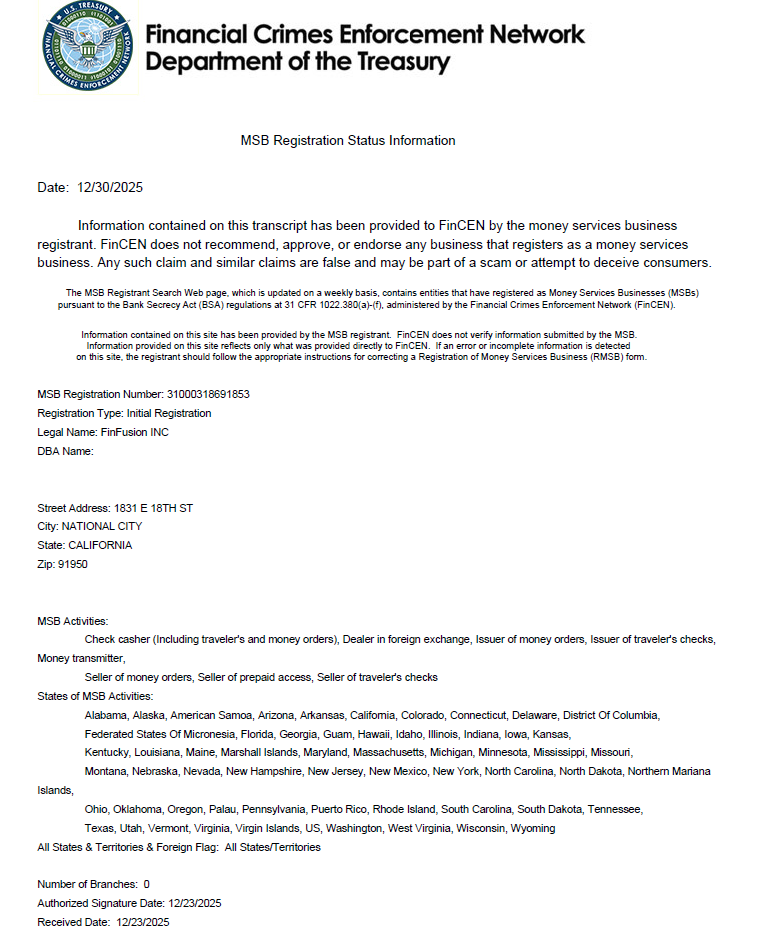 In parallel with corporate disclosure arrangements, FinFusion Exchange's U.S. operating entity has completed registration as a Money Services Business (MSB) under the framework of the Financial Crimes Enforcement Network (FinCEN), a bureau of the U.S. Department of the Treasury.
