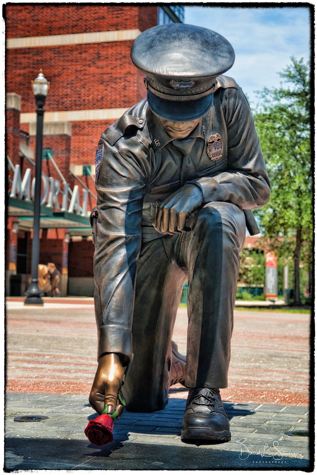 The new statues include two officers standing on either side of the curved wall while another depicts an officer kneeling in front of it, placing a red rose near the blue line that encircles the memorial in a semblance of paying tribute to those who have given their lives in the line of duty. There is also a new granite cube thanking the Finker-Frenkel Legacy Foundation for the donation and a kiosk with information about the memorial.