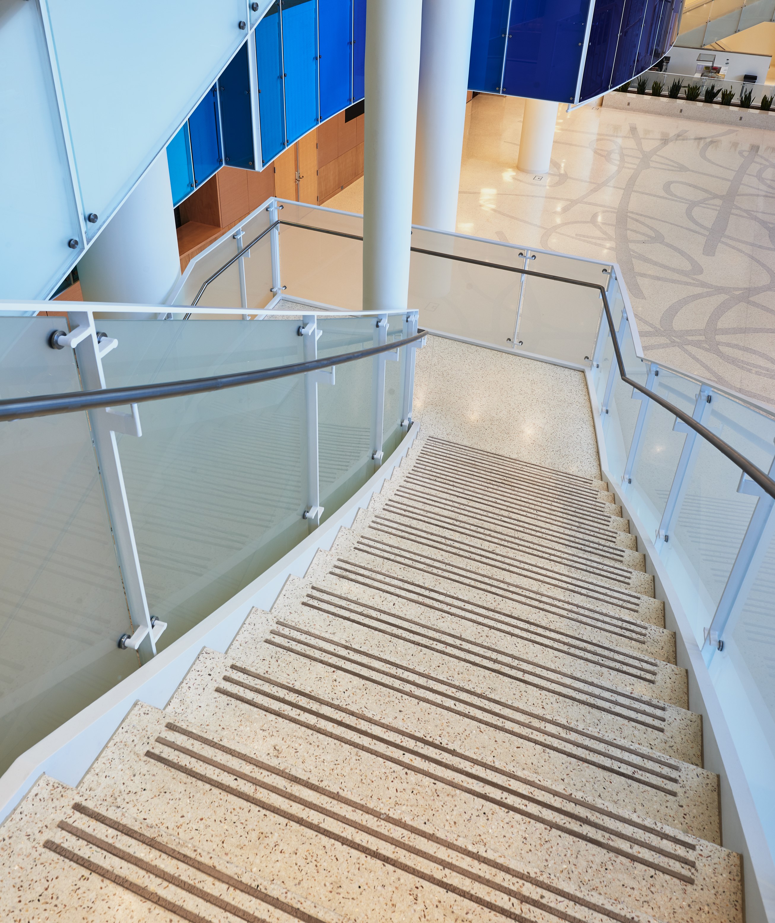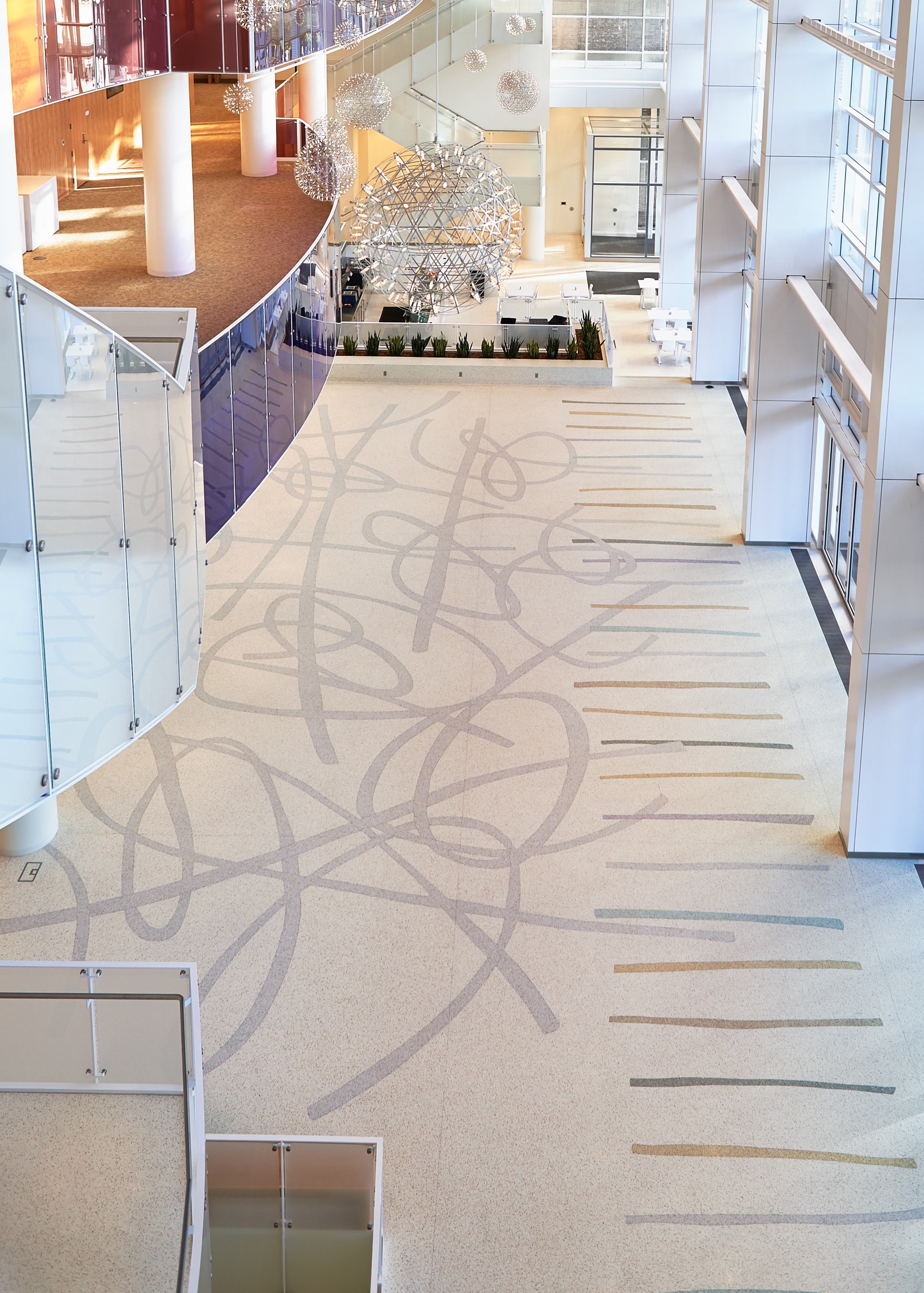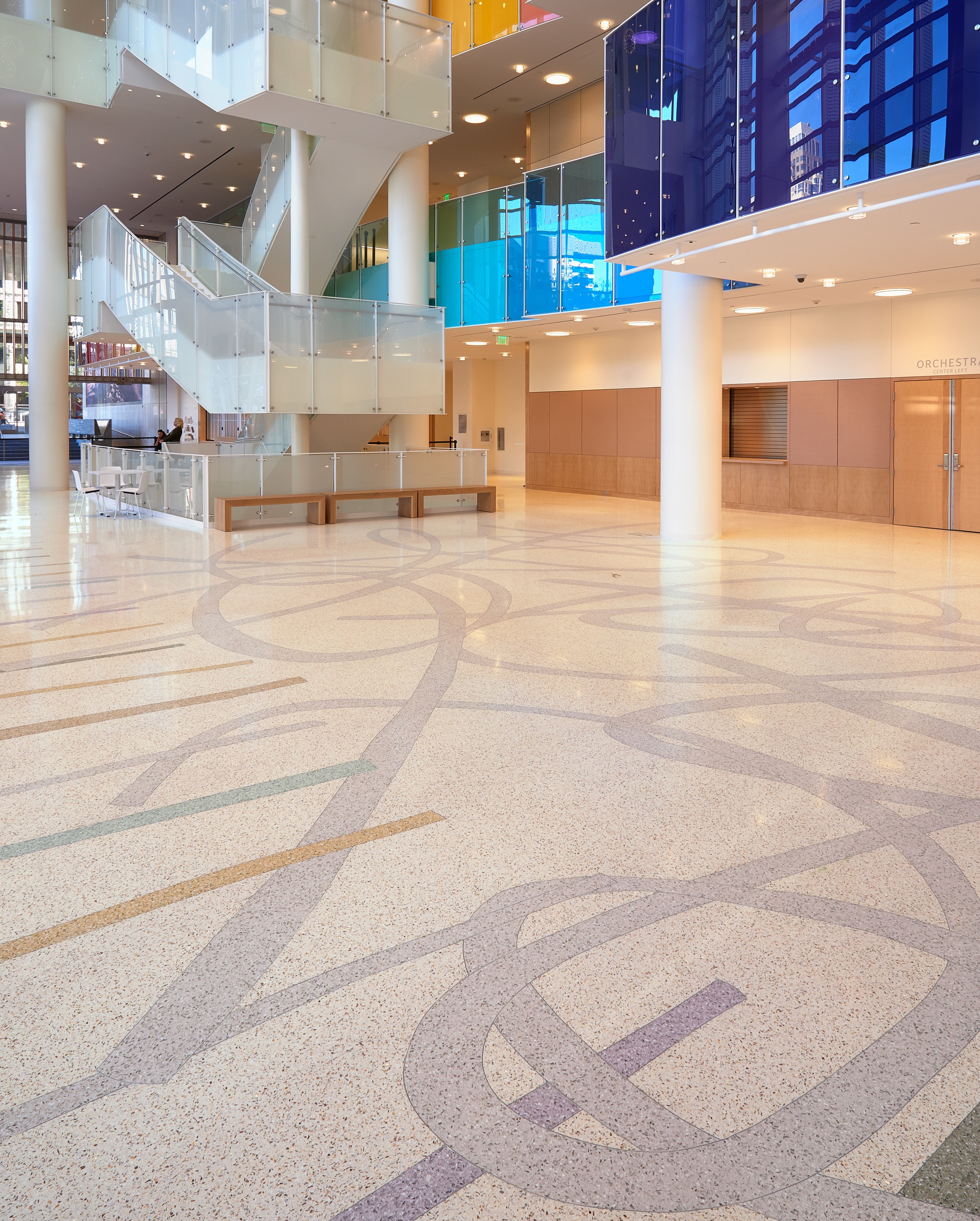 To achieve the unique colors of the floor – “dusty muted tones of purple, green, khaki and grey,” which Wilson explains were inspired by Utah’s natural colors – a unique mixture of aggregates were used, including mother-of-pearl, crushed recycled glass and other mineral aggregates, separated by thin waterjet-cut strips of zinc metal.