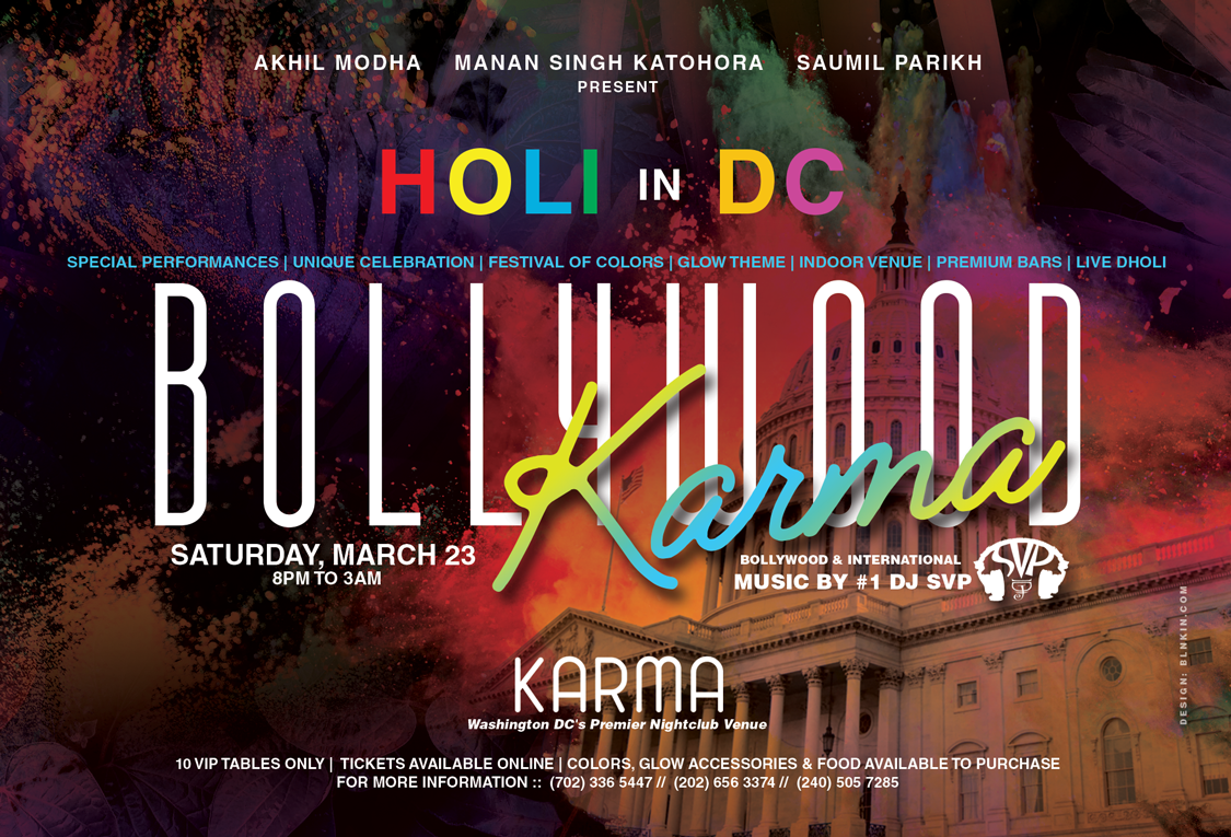WASHINGTON, March 5, 2019 (Newswire.com) - Every year, millions of South Asians UNITE to celebrate the spring festival "HOLI." Brainchild of Manan Singh Katohora (JMD Creations), Akhil Modha (AM Productions) and Saumil Parikh (Band Baaja Entertainment), "BOLLYWOOD KARMA - HOLI in DC" is the first-ever indoor HOLI event with COLORS and GLOW at Washington, D.C.'s premier venue "KARMA DC" - http://dckarma.com/ - with nation's best "DJ SVP" on Saturday, March 23 (8 p.m. to 3 a.m.).