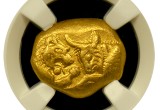 Referred to as a “Prototype Heavy Stater”, the coin was struck by King Croesus in Lydia, or modern-day Turkey and most experts agree that it is the first version of a gold coin ever produced.