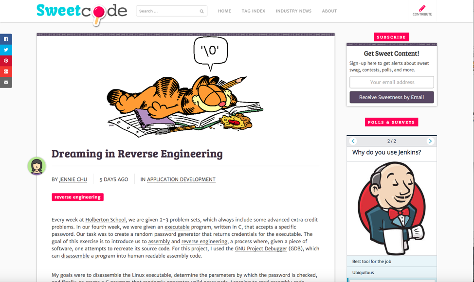 The partnership launched just last month and the impact has already been significant. A recent post (https://sweetcode.io/dreaming-reverse-engineering/) from Holberton School student Jennie Chu received thousands of views in a single day, and delivered a fresh perspective that resonated within the developer community.