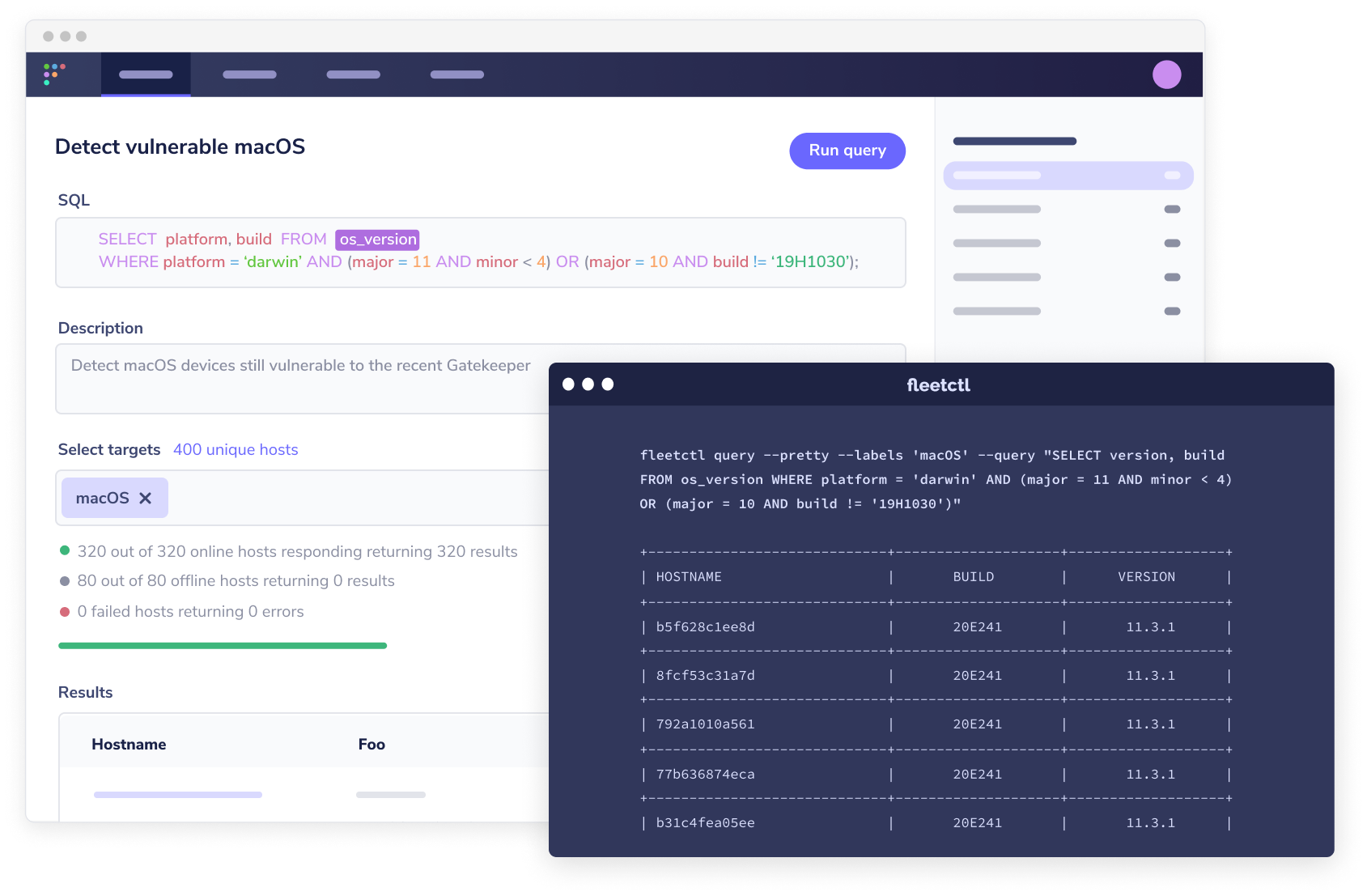 Fleet gives teams quick, reliable access to data about the production servers, employee laptops, and other devices they manage - no matter the operating system. Users can search for any device data using SQL queries, which makes it faster to respond to incidents and automate IT. Fleet can also be used to monitor vulnerabilities, battery health, software, and even EDR and MDM tools like Crowdstrike, Munki, Jamf, and Carbon Black, to help confirm that those platforms are working how administrators "think" they are.