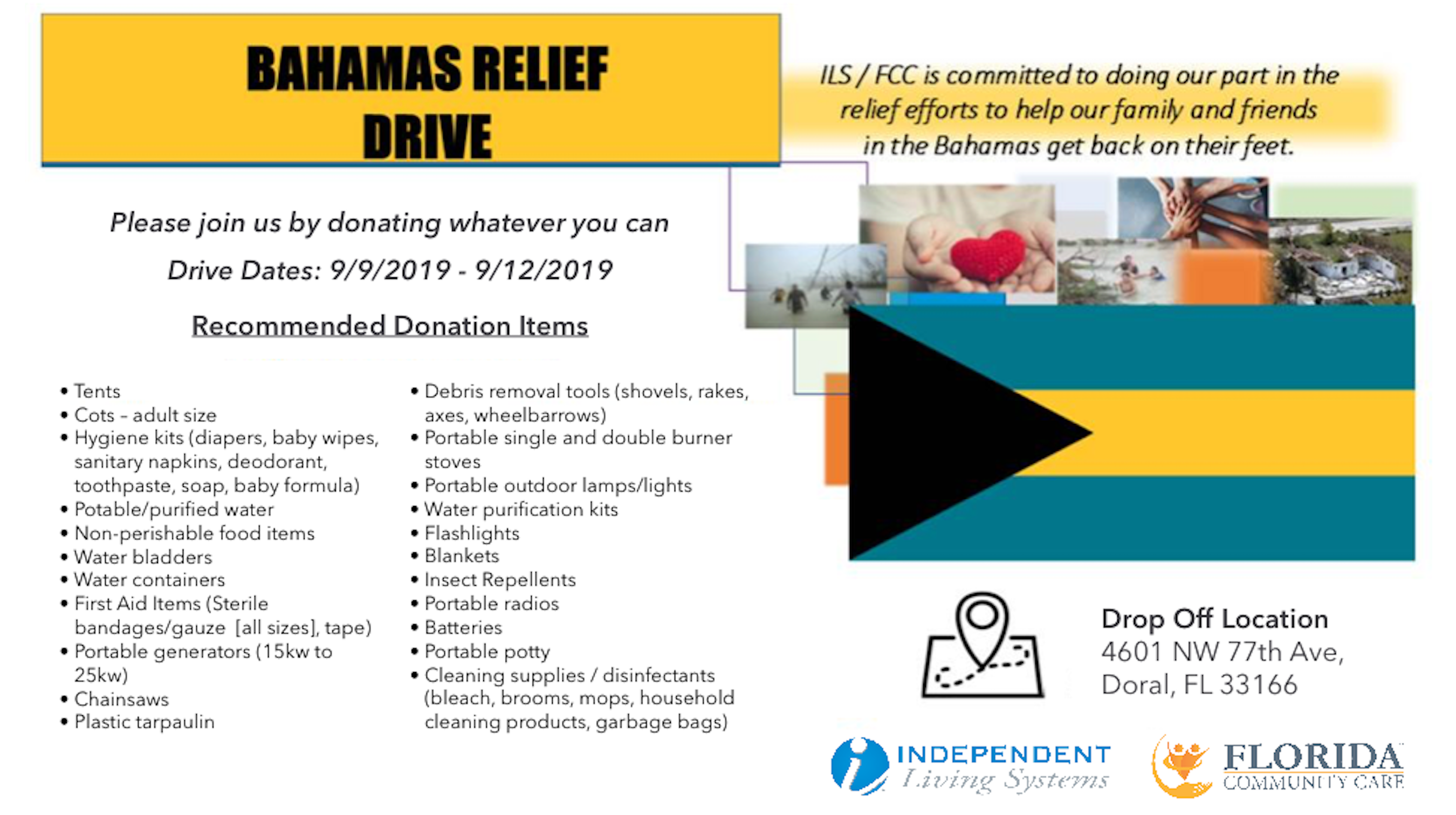 Florida Community Care and Its Parent Company Independent Living Systems Are Collecting Donations to Support the Bahamas as Well as the Evacuees in the Aftermath of Hurricane Dorian