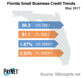 Florida's PayNet Small Business Lending Index (SBLI) registered at 81.1, declining 0.4% from the previous month's state level, but 17.5% beneath this month's national SBLI level (98.3). Small business borrowers are being cautious and holding off on new investment.