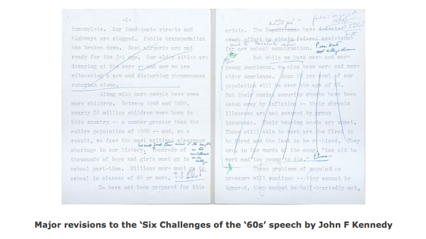 - “The Challenge Abroad”, a large-type reading copy with extensive deletions in both ink and pencil, including revisions in JFK’s hand, of one of his foreign policy speeches (“… there is a real possibility in Formosa that the tail in this case will wag the dog – that, in the event of Chiang’s attack upon the mainland and a Communist retaliation upon Formosa, we will be dragged into a war – possibly an atomic war, probably a world war …”);