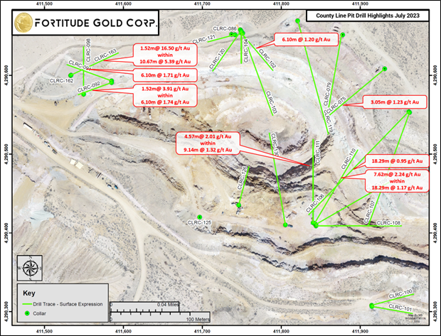 COLORADO SPRINGS, CO, July 24, 2023 (Newswire.com) - Fortitude Gold (OTCQB:FTCO) (the "Company") announced drill results from its County Line gold project located in Mineral and Nye Counties, Nevada. Intercepts include 10.67 meters grading 5.39 grams per tonne gold (g/t), and 7.62 meters grading 2.24 g/t gold. The Company also released rock chip sample results from the north side of its East Camp Douglas property with assays up to 36.6 g/t gold. Fortitude Gold is a gold producer, developer, and explorer with operations in Nevada, U.S.A. offering investors exposure to both gold production and dividend yield.