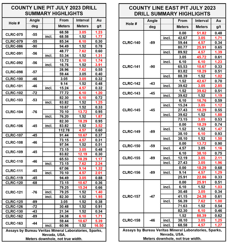 The drill program expanded the mineralized zone at the County Line main open pit with step-out holes to the northwest, east, and south by focusing on the periphery of the historic pit. The Company plans to continue step-out and infill drilling at the County Line pit with a goal to expand the mineralization and to further optimize the open pit mine plan.