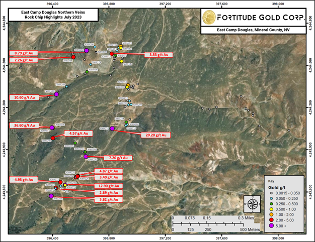 The Company recently completed a mapping and rock chip sample program on the north end of its East Camp Douglas property. While a near term drill program on the southern lithocap is imminent, the mapping and sampling program focused on the northern veins to develop a maiden near-term drill program. Rock chip samples assayed as high as 36.6 g/t gold, 20.2 g/t gold, 12.9 g/t gold and 10.6 g/t gold with multiple samples returning grades in excess of both 5 and 1 g/t gold (full assay table below). Surface gold over a large area further adds to the Company's geologic model of East Camp, both north and south, of being a large epithermal, high-grade gold bearing system with surface and near surface gold. The Company recently filed a Notice of Intent (NOI) with the Bureau of Land Management for an initial drill program at the northern veins and expects a decision in the coming weeks. While this would be Fortitude Gold's first drill program on the north veins, previous operators defined high-grade gold through multiple drill intercepts.