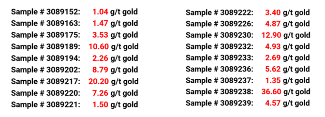 East Camp Douglas Northern Veins high-grade surface samples* include (g/t=grams per tonne)(see map below):