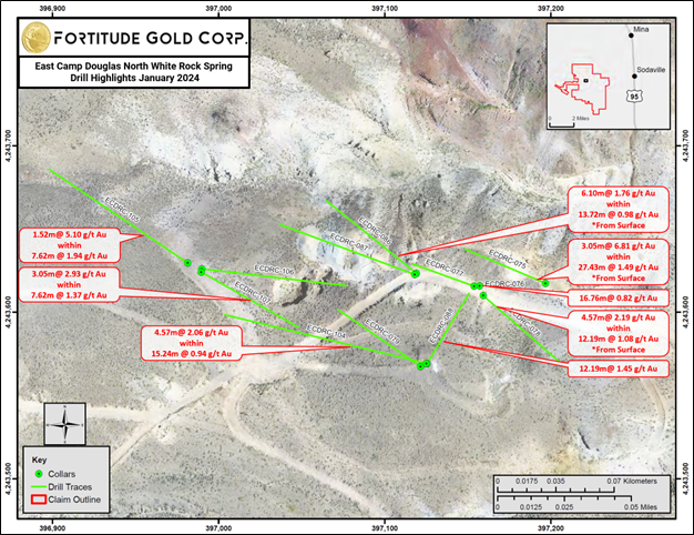 "It is exciting to continue to intercept significant surface and near surface gold at East Camp Douglas North," stated Mr. Allan Turner, Vice President of Exploration for Fortitude Gold. "Hole locations were based on detailed surface mapping and sampling campaigns that were performed in 2023. The surface mapping indicates that the structures that host the gold continue along strike into areas not yet drilled. We are currently updating our geologic model with results from this program and are planning a follow up drill program the first half of 2024."