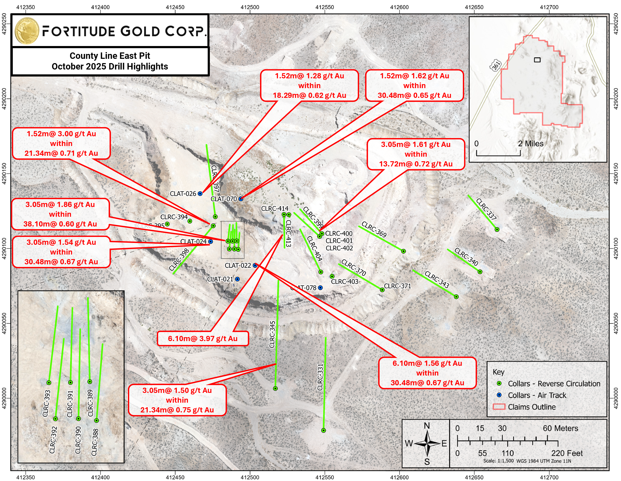 "This County Line East Pit drill program intercepted significant near surface intervals of oxide gold mineralization," stated Mr. Allan Turner, Vice President of Exploration for Fortitude Gold. "We look to expand County Line, and with the project now fully permitted, we have the ability to drill freely inside the new Plan of Operations boundary. These and other recently announced drill results from County Line are being modeled for potential inclusion into a mine operations plan and possibly an update of our County Line Project resource estimate."
