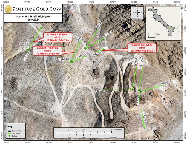"Located next to our Isabella Pearl deposit and process facility, Scarlet North continues to deliver near surface, high-grade oxide gold for potential future ore feed," stated Mr. Jason Reid, CEO and President of Fortitude Gold. "16.76 meters, or 55 feet, of over 1.5 grams per tonne gold builds on previous successful drill programs at Scarlet North. While we continue to build on and evaluate Scarlet's open-pit potential, we are positioned to submit a permit modification to the Bureau of Land Management to expand the current Isabella Pearl mine plan boundary to encompass the Scarlet North area. The modification would seek approval to both mine Scarlet North and expand exploration efforts in the area. Continued gold intercepts like these move us closer to our goal to add Scarlet to the queue of future mine builds."