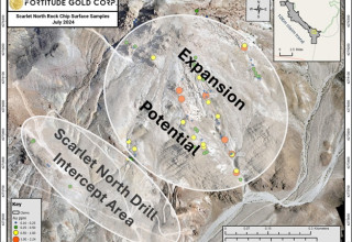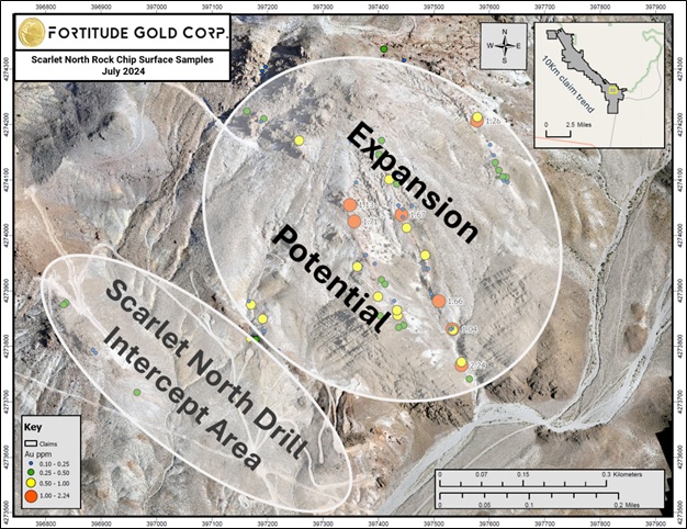 "Scarlet North continues to return high-grade near surface oxide gold intercepts, moving us closer to an initial resource," stated Mr. Allan Turner, Vice President of Exploration for Fortitude Gold. "Our exploration team also collected multiple rock chip surface samples from a new northeast target area at Scarlet North, with the highest assaying 2.24 g/t gold. These rock chip samples may be an indicator of gold mineralization expanding to the northeast at Scarlet North, which the Company plans to test with future drill programs. We look to define a potentially significant disseminated gold system over an extensive area at Scarlet North, with a goal to vector in on feeder structures while we move closer to an initial resource from which to expand upon."