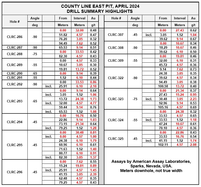 The County Line East Pit reverse circulation drill program builds on the Company's April 4, 2024 press release where it discovered a high-grade gold feeder zone with intercepts including 16.76 meters of 2.19 g/t gold. That drill program returned multiple intervals of oxide gold mineralization grading in excess of 1 gram per tonne at and near surface. This latest drill program focused a portion of the drill holes into the feeder system and intercepted the highest gold grade drilled to date at the East Pit. The East Pit is located approximately 500 meters southeast of the main County Line historic open pit. The Company targets near-term County Line gold production from both pits.