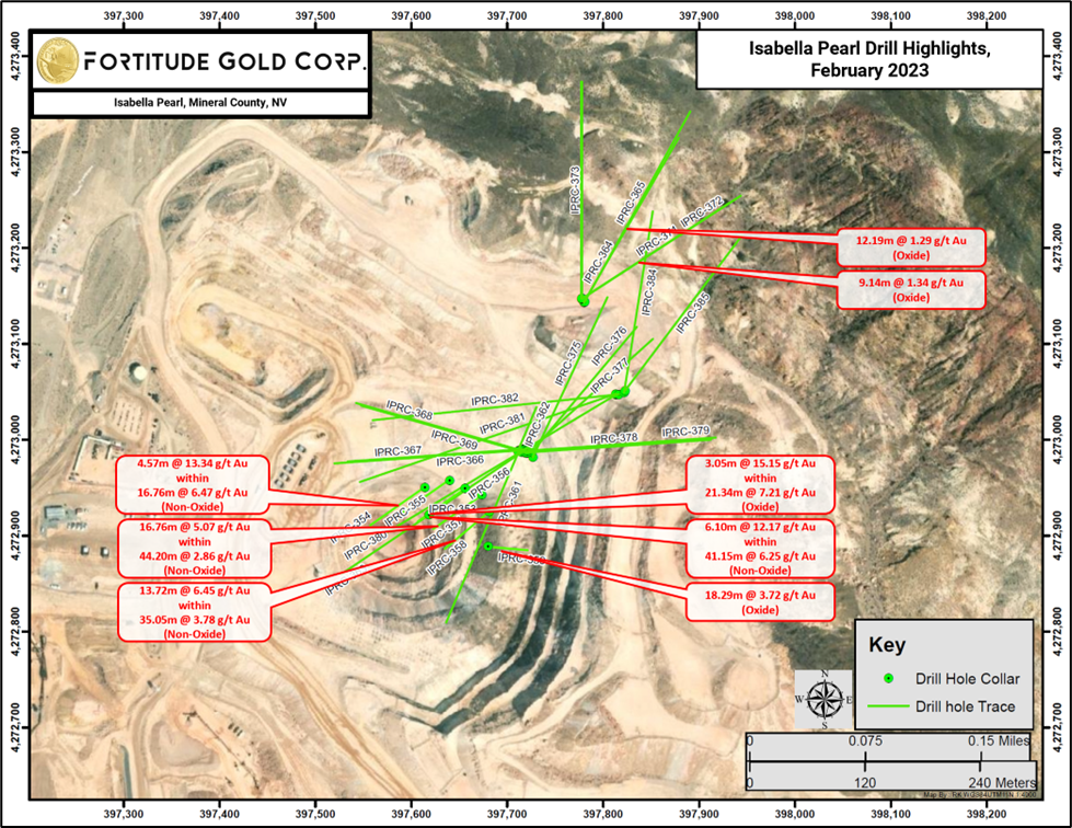 "Oxide intercepts including twenty-one meters of over seven grams per tonne gold underscore what an amazing deposit the Isabella Pearl is," stated Mr. Jason Reid, CEO and President of Fortitude Gold. "We look to get as much of this oxide and transitional material in the mine plan as possible which is likely to warrant a modification request to our permit to extend and mine the pit a few benches deeper. Though we do not have a current plan to mine nor the facilities to process the high-grade non-oxide gold ore at Isabella Pearl, it is exciting to see non-oxide intercepts including forty-one meters grading over six grams gold and consider future optionality for this material."