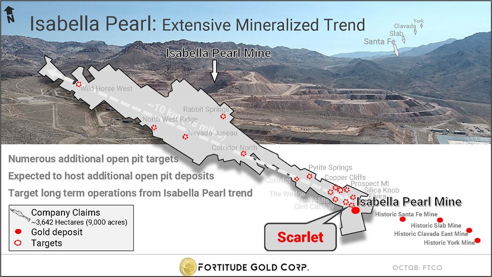Mr. Reid continued, "While we expected to find the margins of this mineralization to the southeast, in the direction where we previously completed condemnation drilling for the heap leach pad expansion, this high-grade mineralization remains open to the northwest along trend. We recently announced the permit receipt to expand the Isabella Pearl heap leach pad. Included in this permit was an expansion of the Isabella Pearl mine plan boundary to the northwest, which opens up additional acreage associated with the Scarlet target for exploration within the permitted mine plan. Scarlet is just one of multiple gold targets associated with our 9,800-acre Isabella Pearl property covering over six miles of an important mineralized fault corridor in the Walker Lane Mineral Belt."
