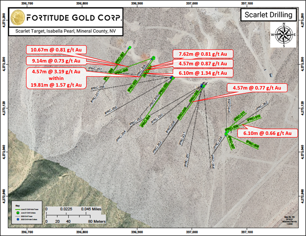 COLORADO SPRINGS, CO, August 24, 2021 (Newswire.com) - Fortitude Gold Corp. (OTCQB:FTCO) (the "Company") today announced exploration results from its 2021 Scarlet phase two drill program including 4.57 meters of 3.19 grams per tonne (g/t) gold within 19.81 meters grading 1.57 g/t gold. This mineralization is associated with the northwestern structural extensions of its Isabella Pearl mine located in Mineral County, Nevada. Fortitude Gold is a gold producer, developer, and explorer with operations in Nevada, U.S.A.