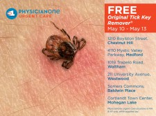 This Thursday through Sunday – May 10 through May 13 – PhysicianOne Urgent Care locations in Massachusetts (Chestnut Hill, Medford, Waltham, and Westwood) and Westchester County, New York (Mohegan Lake and Baldwin Place) are handing out free Original Tick Keyâ tick removers, while supplies last.