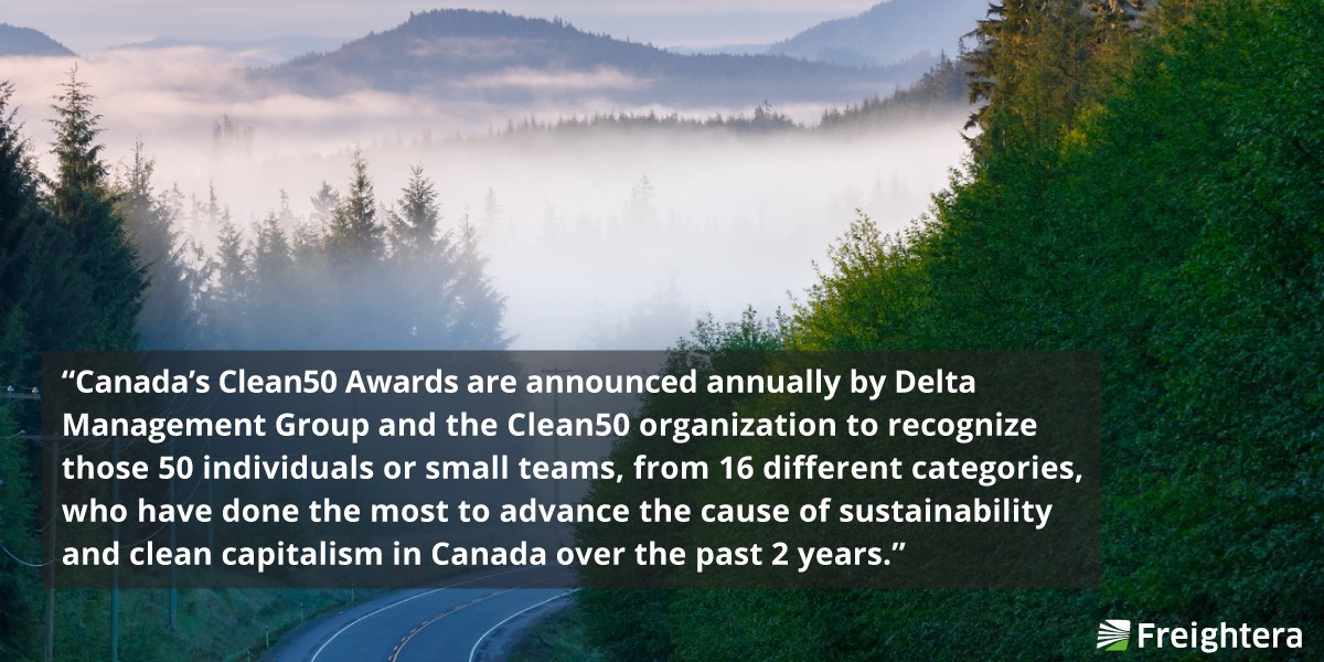 Clean50 is one of the most important awards for corporate contribution to environmental sustainability in Canada. This means a lot to everyone at Freightera, an online marketplace that brings together businesses that need to ship freight and transport companies that move it. Freightera’s mission is to make freight easy, accessible and green.