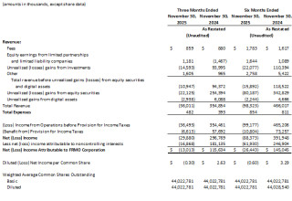 Net loss attributable to the Company excluding the effect of unrealized gain or loss from equity securities and digital assets net of taxes for the three months ended November 30, 2025 was $7.3 million ($0.17 per diluted share) compared to net income of $46.1 million ($1.05 per diluted share) for the three months ended November 30, 2024 (as restated). The six-month figures, as of the same end dates, are a net loss of $8.6 million ($0.20 per diluted share) in 2025 compared to net income of $53.3 million ($1.21 per diluted share) in 2024 (as restated).