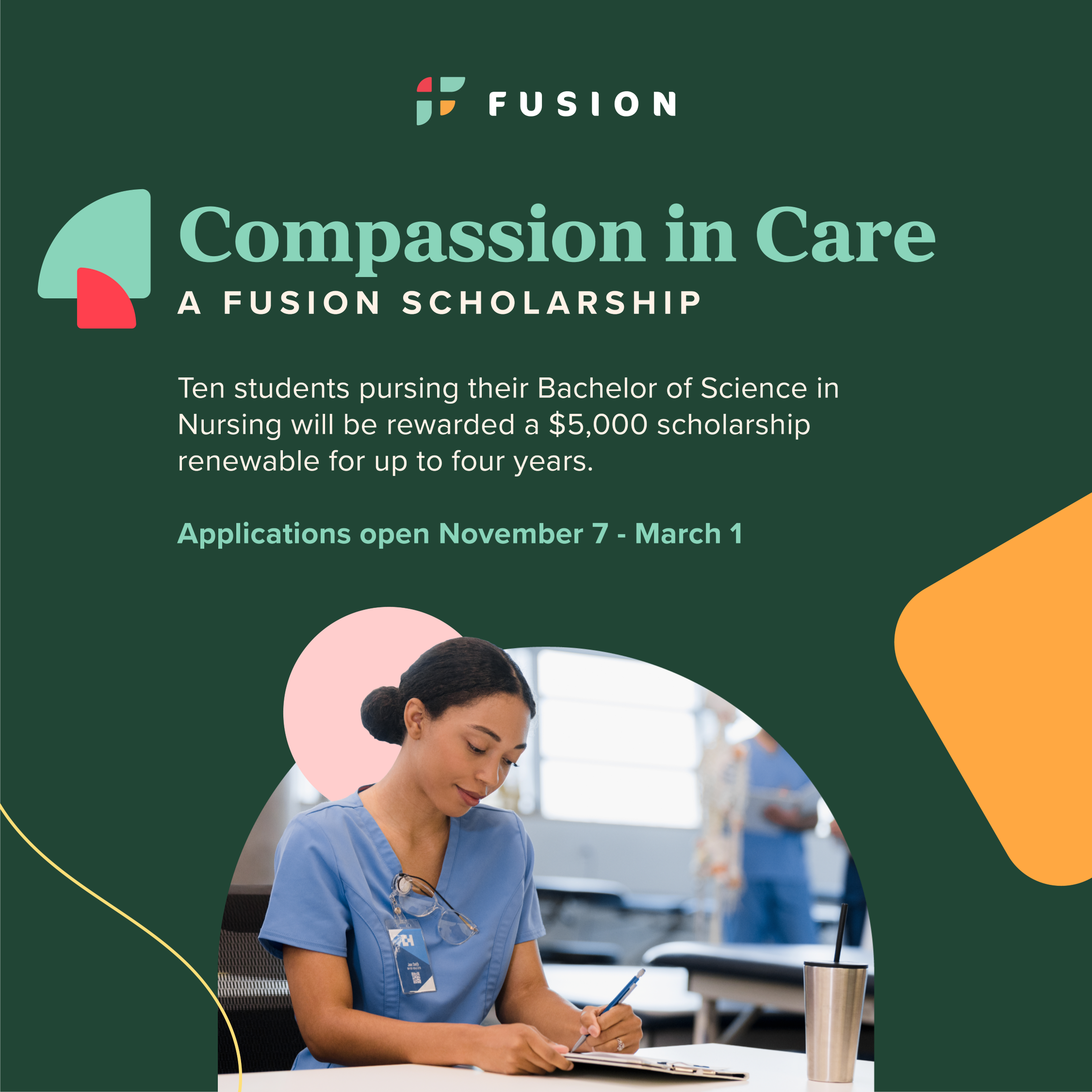 ELKHORN, Neb., November 13, 2023 (Newswire.com) - Fusion has announced a new scholarship program, Compassion in Care – A Fusion Scholarship, aiming to assist students pursuing their Bachelor of Science in nursing. The application is open now and will close in March 2024. Ten recipients will be awarded $5,000 and will be matched with a Fusion mentor who will provide guidance while they attend nursing school.