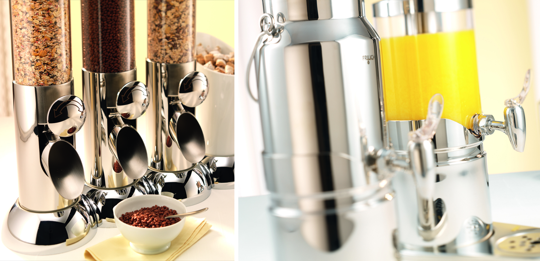 For over two decades FRILICH has been the leading market maker with its innovative products for the buffet in hotels and gastronomy. FRILICH has already been the inventor and provider of the first juice and milk dispensers since 1986, which, in today's breakfast buffet, are unimaginable without. For the equipment of complete buffets in the hotel industry and gastronomy, FRILICH offers a wide range with many variations of presentation and dispenser systems. All design lines grant an atmospheric and incomparable performance without having to resign the high demand on quality and functionality.