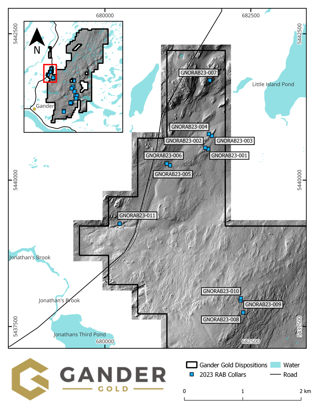 VANCOUVER, July 4, 2024 (Newswire.com) - Gander Gold Corp. ("Gander" or the "Company") (CSE:GAND)(OTCQB:GANDF), is pleased to provide an exploration update on its Gander North Project in Newfoundland where 28 rotary air blast ("RAB") drill holes, an exploration tool designed to prioritize first-ever diamond drilling targets, were completed in 2023.