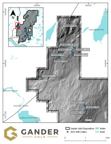 Gander Gold completed a total of 34 RAB drill holes across its Newfoundland properties in 2023 including three (3) at Lizard Pond (Gander South) where diamond drill targets have been outlined after 1 RAB hole cut 13.7 metres grading 1.06 g/t Au starting from surface (refer to Nov. 30, 2023 news release).