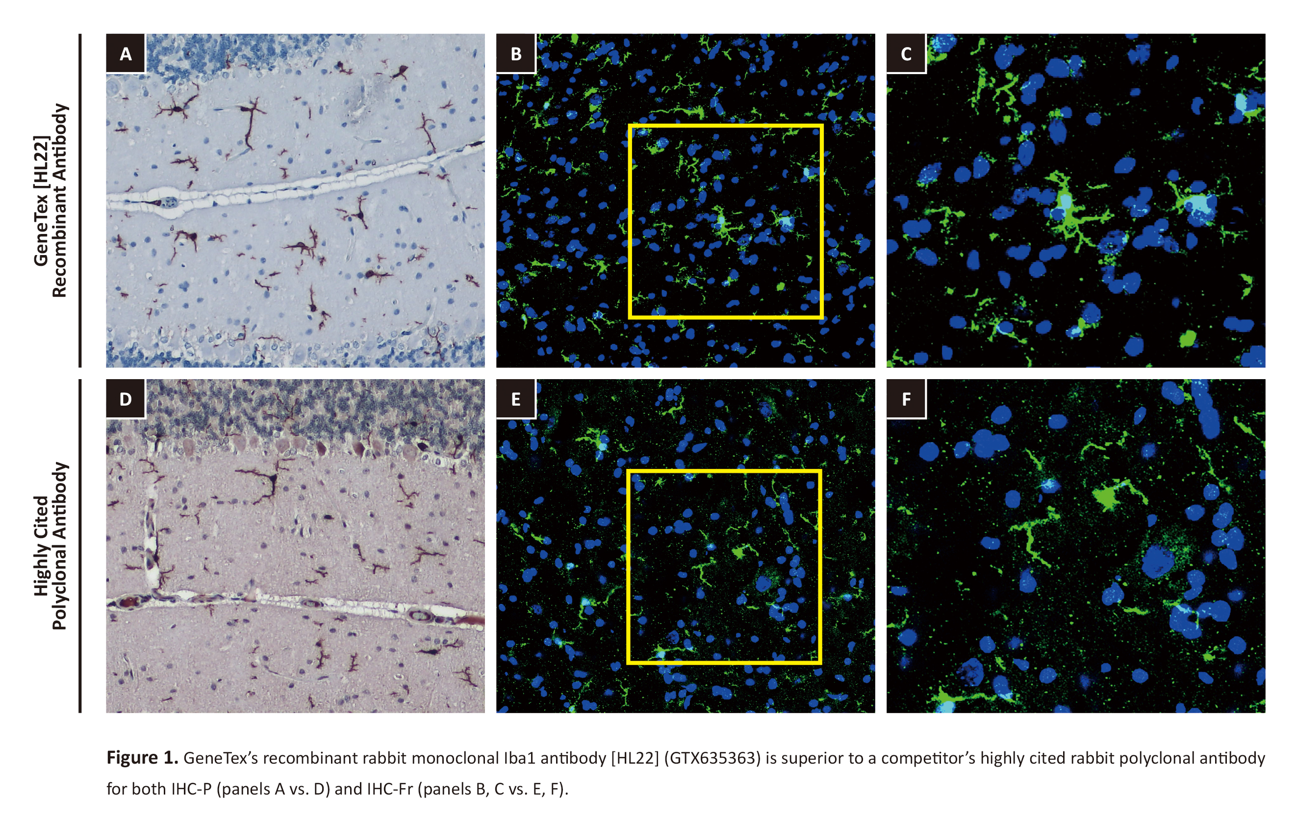 IRVINE, Calif., February 25, 2020 (Newswire.com) - GeneTex, a research antibody manufacturer for more than 20 years, announces the release of a new recombinant rabbit monoclonal Iba1 antibody. Clone [HL22] detects Iba1, a protein commonly used as an immunohistochemical marker of both quiescent and activated microglia. In its development and production, both paraffin- and frozen-IHC analyses (IHC-P, IHC-Fr, respectively) were conducted in the screening process and clone [HL22] was identified as exceptional for these critical applications (Figure 1A-C). This reagent’s success in IHC-Fr is particularly noteworthy to neuroscientists, as the current market-leading commercial antibody is a rabbit polyclonal and GeneTex’s recombinant rabbit monoclonal offers consistency and specificity advantages (Figure 1). In addition, the antigen-binding regions of this antibody are also available in the context of both mouse and rat IgG backbones, thus extending flexibility for multiple staining.