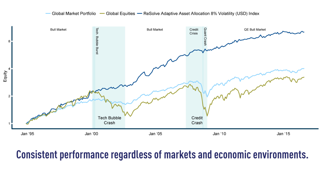 Mr. Philbrick believes the best way to address investor emotions is to deploy strategies that automatically respond to major shifts in global markets. That means shifting toward safer assets in response to rising risks, while moving quickly to take advantage of evolving opportunities. The ReSolve Online Advisor delivers the transparency and cost-effectiveness found in traditional robo-advisor offerings, but adds cutting-edge adaptive investment methodologies with the potential to thrive under any economic conditions. ReSolve Online Advisor strategies are designed to effectively navigate even the most difficult economic conditions, including periods like the 2008 Global Financial Crisis, which inflicted over 30-50% losses on traditional investment portfolios.