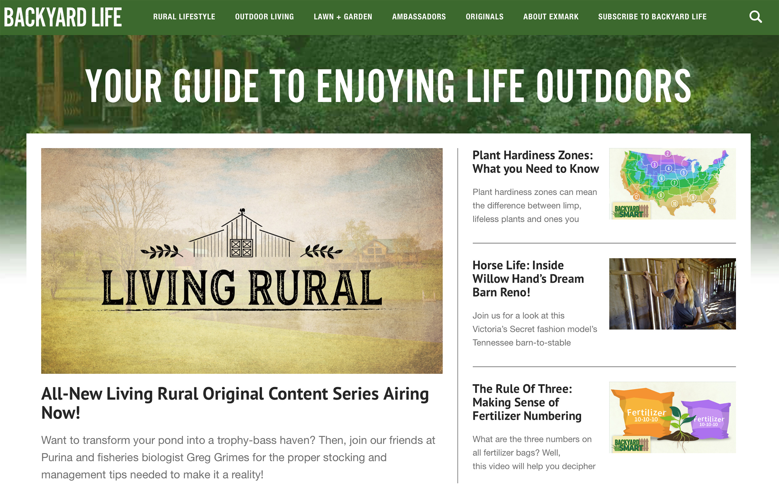 With a variety of blogs, how-to videos and lifestyle features, Backyard Life gives visitors an immersive multimedia experience. Exmark has partnered with leading influencers and content experts to create original content that's both informative and entertaining. Exmark Original Series content includes the Backyard Smart, Done-In-A-Weekend Projects, Done-In-A-Weekend Extended Cuts, Dream Yards, Living Rural and Prime Cuts series.