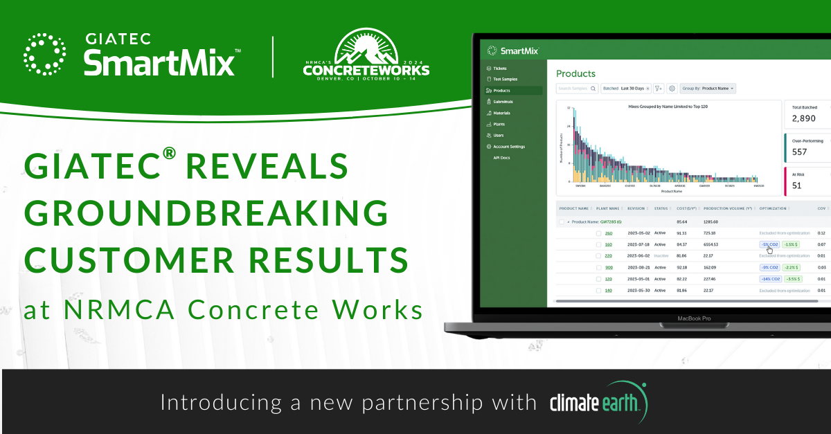 OTTAWA, Ontario, October 10, 2024 (Newswire.com) - Giatec®, the world leader in concrete technology platforms, is proud to announce SmartMix™ has achieved unprecedented customer results while introducing the newest integration partnership with Climate Earth at NRMCA Concrete Works 2024. Since its launch at last year's Concrete Works in Nashville, SmartMix has transformed concrete mix management. Powered by Giatec's AI, Roxi, it enables real-time adjustments and optimizations, giving producers full control and advanced insights to enhance mix consistency, quality, and efficiency in the ready-mix industry.