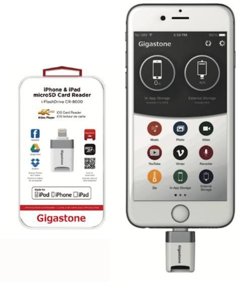 - The Gigastone iOS Flash Drives have both Lightning and USB adapters or removable MicroSD cards, so backed up data can easily be moved to any computer without the need for the iDevice.