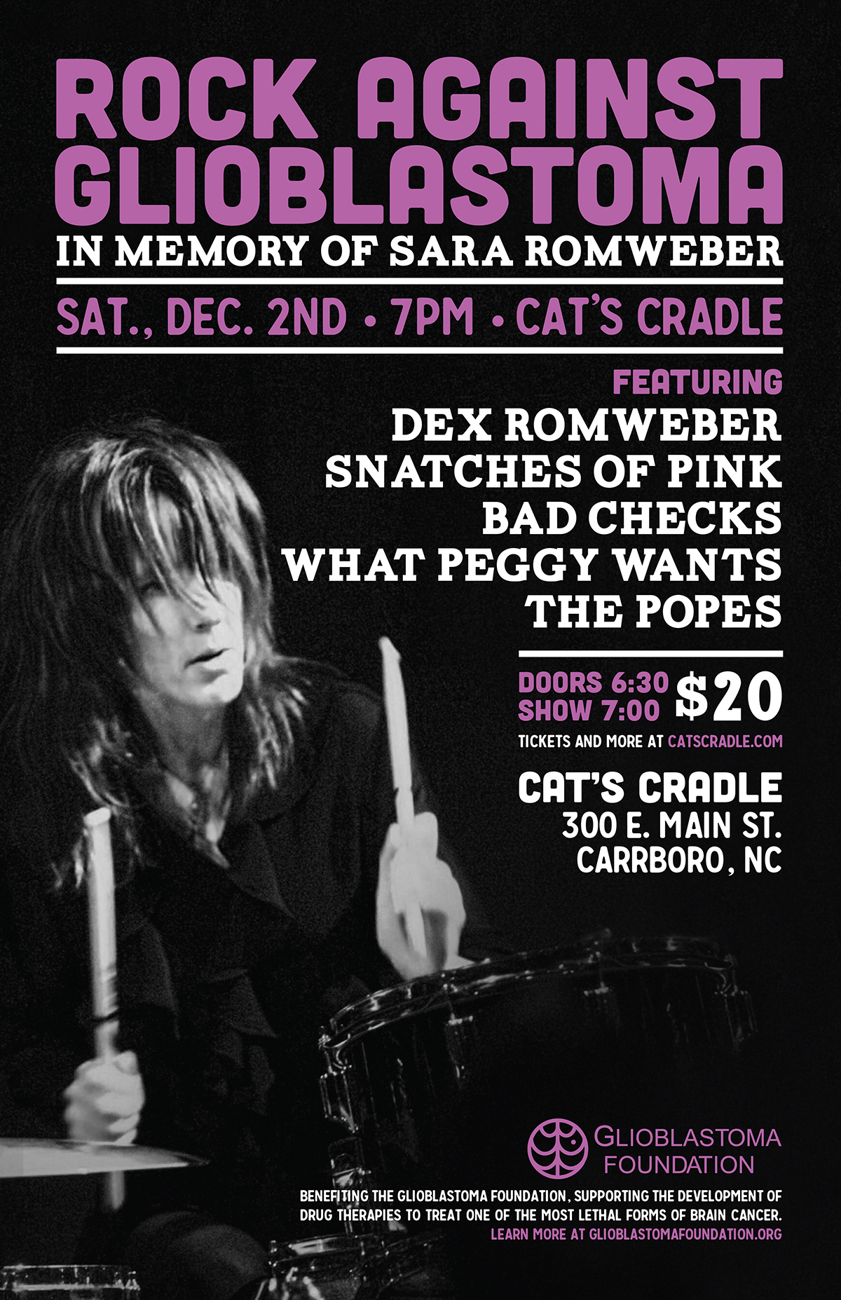 Rock Against Glioblastoma (RAG) takes place December 2nd at the historic Cat’s Cradle in Chapel Hill, NC, featuring an incredible lineup of well-known performers. Doors open at 6:30 p.m. EST, with performances by The Popes, What Peggy Wants, Bad Checks, Snatches of Pink, and Sara’s brother Dex Romweber. Tickets are available at the door and online for $20.