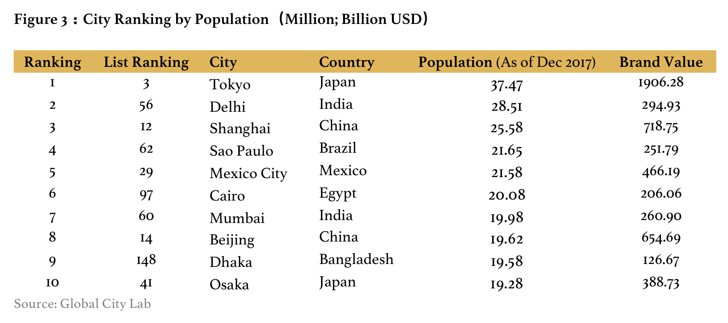 The competition among cities is primarily among their customers. The flow of investors, tourists, international students and professionals always affects the development of a city. In this study, Global City Lab adopted a customer-based brand valuation approach, emphasizing the equity of the city brand relationship and customers’ recognition of the city. The threshold for the list of the top 500 global city brands in 2019 is 19.22 billion dollars. There are six cities with brands exceeding 1 trillion US dollars, 18 with 500 billion–1 trillion US dollars and 164 with 100–500 billion US dollars. More than 60% of city brands are worth less than 100 billion US dollars.