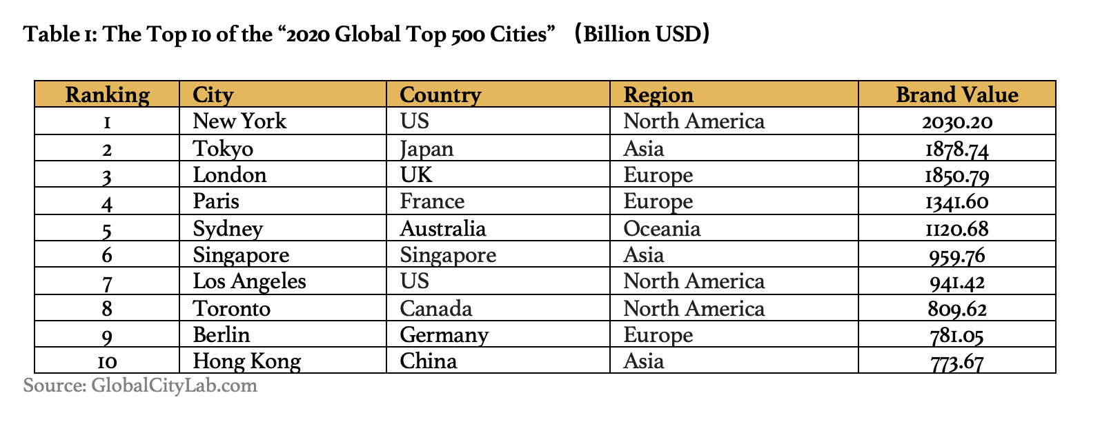 A city's brand represents the comprehensive strength of the city. It also affects the potential for future development of the city because it determines the flow of capital, information, goods, and talent to the city. Therefore, an evaluation of a city's brand value will provide a clearer judgment and understanding of the city. Global City Lab is the world's first professional organization engaged in city brand value evaluation. It calculates the brand value of major cities in various countries using the six dimensions of economic growth, culture, governance, environment, talent, and reputation. Global City Lab publishes its "Global Top 500 Cities" analytical report annually.
