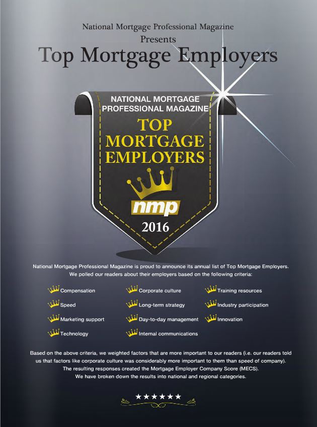 National Mortgage Professional Magazine polled its readers on their employers based on the following criteria: speed, training resources, industry participation, compensation, marketing support, technology, corporate culture, day-to-day management, long-term strategy, internal communications, and innovation. Gold Star Mortgage has been ranked highly in each of these categories.