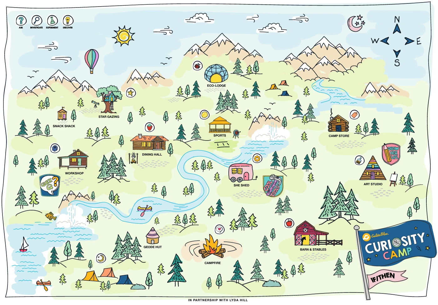 Curiosity Camp, produced by GoldieBlox in collaboration with IF/THEN®, an initiative of Lyda Hill Philanthropies, is free to all and is hosted on the GoldieBlox website and on the GoldieBlox YouTube channel. Campers navigate their way around Curiosity Camp using a virtual map that encourages them to explore the featured content and engaging downloadable activities. Along the way, they collect badges to complete their Curiosity Camp experience.