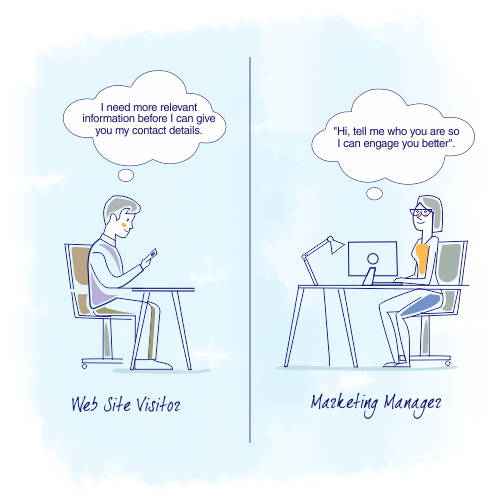 It’s a chicken and egg problem in that the marketing managers cannot effectively engage visitors until they know the visitor’s identity and visitors are reluctant to engage until they are convinced the offering is relevant and useful to them. The key to solving this conundrum is to enable each visitor to self-determine (personalize) their customer journey so they can consume content that is truly relevant to them. In turn, marketing can then learn from their behavior to recommend increasingly more relevant content.