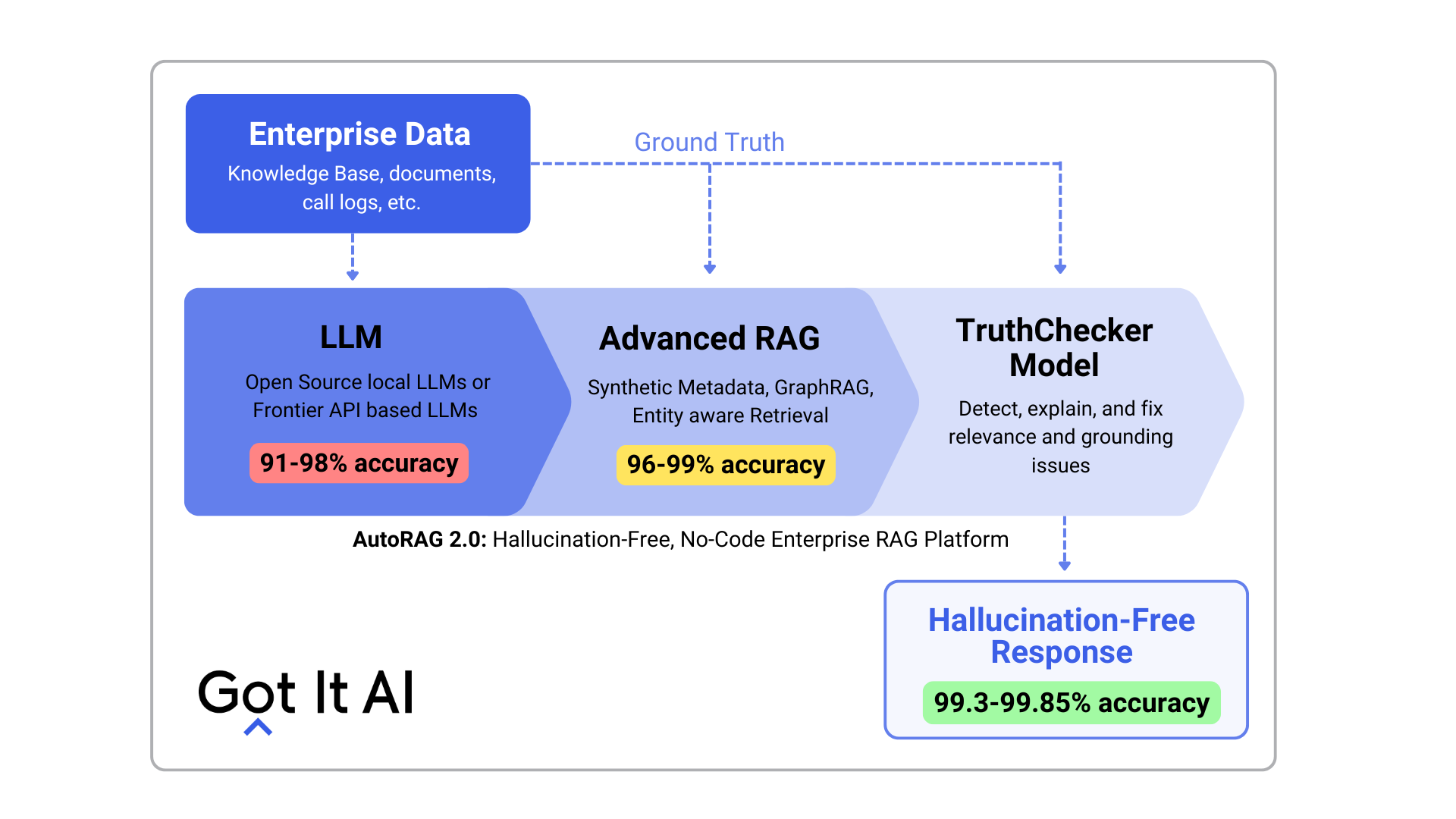 - TruthChecker LM: Unique technology using a low-latency and low-cost, fine-tuned, task-specific Language Model (LM) that virtually eliminates LLM hallucinations in the generated RAG pipeline. When used with GPT-4 Turbo-class models, it delivers better than 99.8% response accuracy. Even with open-source models like Llama 3.1-70B, 99.3% accuracy is achieved without fine-tuning the TruthChecker on enterprise data. Visit https://www.app.got-it.ai/blog for more information.