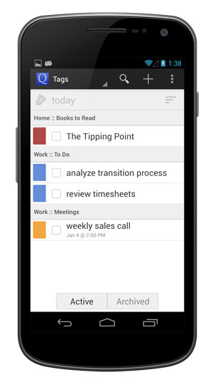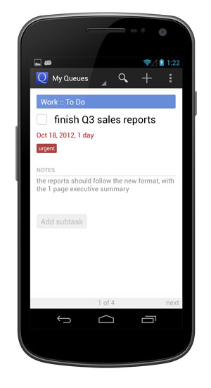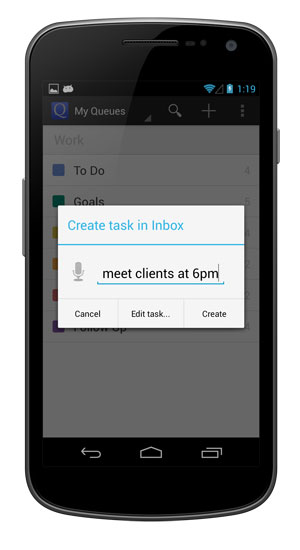 The GQueues app for Android provides fast background syncing, voice input to create tasks and the option of creating home screen shortcuts to a subscriber's most-used queues. Initial feedback from beta testers revealed voice input as one of the most popular features. Users can speak tasks on the go and let GQueues parse out dates, times and reminders thanks to its powerful Quick Add Syntax.
