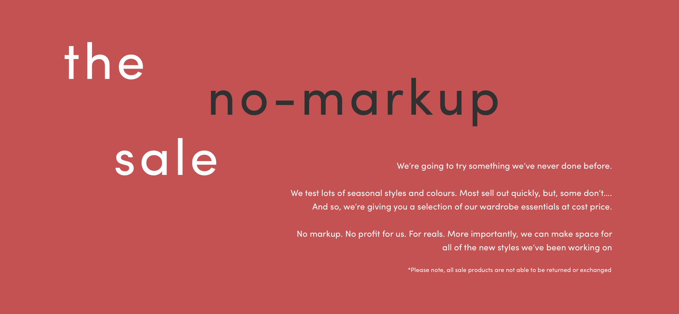 Luke adds, “The no-markup sale is not a new chapter for us, as we make it possible to have the most accessible prices for luxury basics all year round but it’s our nifty solution to a little overcrowding to make room for new essentials. I’m proud of our collection and over the last two years, we’ve experimented with new styles and colours, the reality is we made too many of some. I don’t agree with confused messages with ‘big blowout sales’ or inflating original prices to make sales look like a greater bargain, it’s just not our way.”