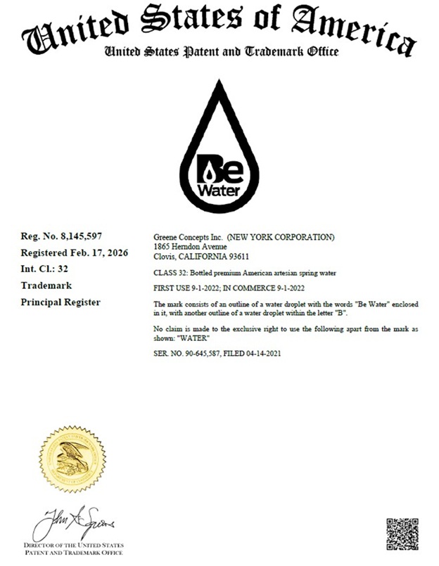 "This registration reflects the years of work invested in developing Be Water as a premium American artesian spring water brand," Greene added. "As we continue expanding distribution and building awareness, having our trademark fully registered adds clarity, credibility, and long-term protection to everything we are building."