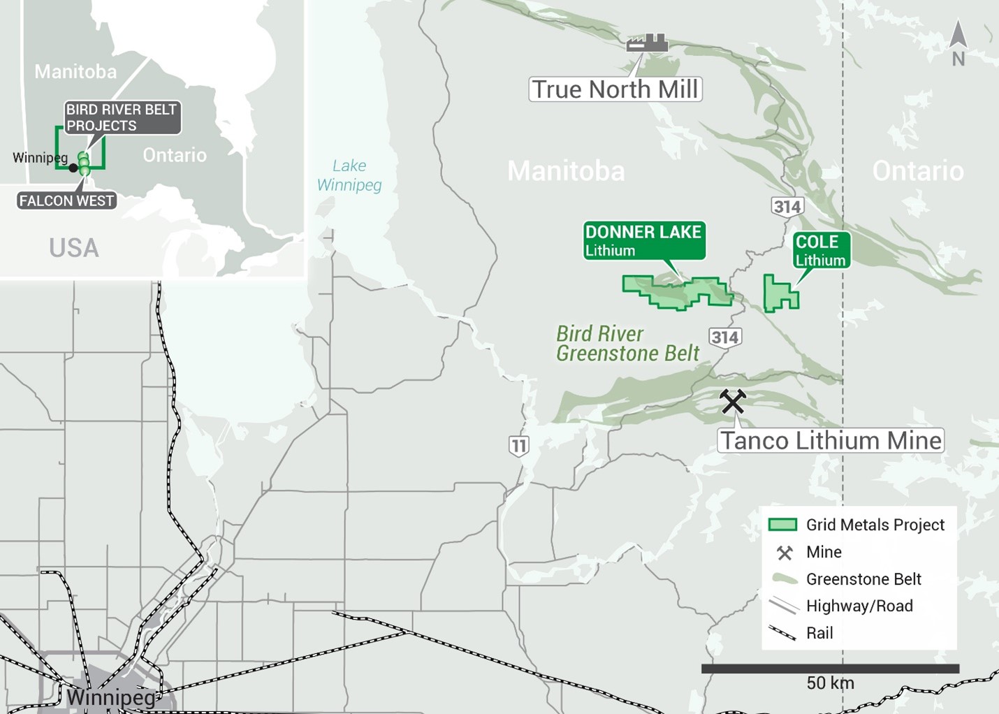 Grid Metals is focused on both lithium and Ni-Cu-PGM projects in the Bird River greenstone belt in southeastern Manitoba, approximately 150 km northeast of Winnipeg Manitoba. The company controls two major lithium properties both with known high-grade lithium pegmatites: Donner Lake and Falcon West. The 75% owned Donner Lake Property is situated 35km north of the producing Tanco mine, one of only two lithium-producing mines in Canada. In addition to the lithium assets, the Company controls a PEA stage Ni-Cu-PGM-Co project (Makwa-Mayville) undergoing exploration and development activity. The Donner Lake and Falcon Wet properties are located in the traditional territory of the Sagkeeng First Nation.