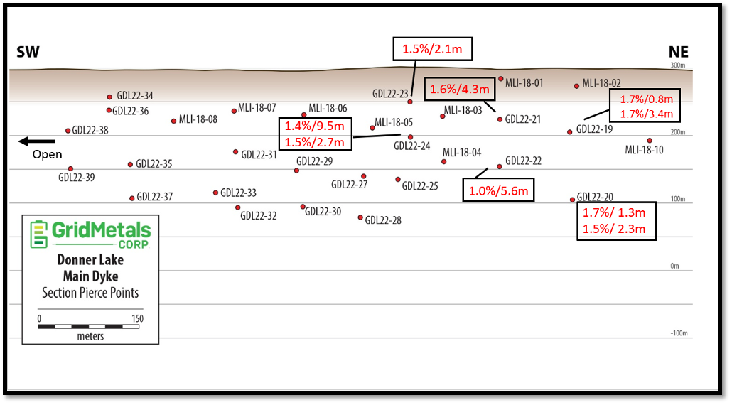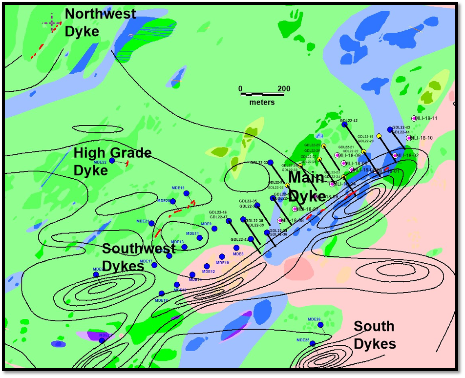 Above: Long section of Main Dyke (looking northwest, perpendicular to the strike of the Main Dyke) showing location of Main Dyke drill holes, results from drill holes GDL22-19 to GDL22-24 (in red) and pierce points for drill holes up to and including hole GDL22-39. Analytical results for holes GDL22-25 to GDL-22-39 are pending.