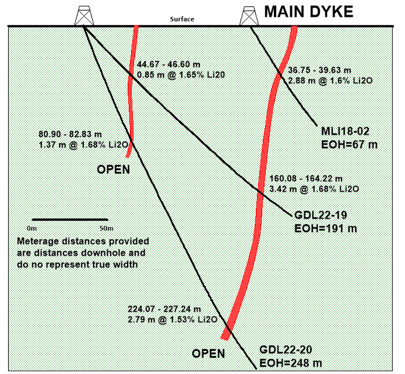 Above: Length-weighted average Li2O grades for the Main Dyke pegmatite intersections in drill holes GDL22-19 to GDL22-24. Based on the hole inclinations and the interpreted average dip of the Main Dyke of ~75 degrees, the true thickness is estimated to represent between 55 and 85% of the lithium zone interval lengths reported in this table.