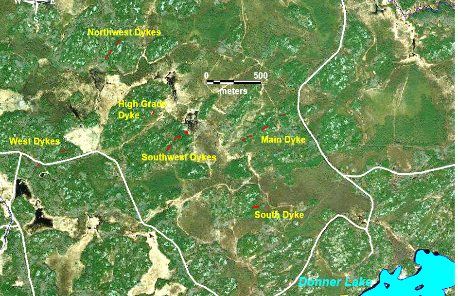 Above: Plan view of the Donner Lake Pegmatite Field. Grid has now drilled 40 holes at the Main Dyke ( 29 in 2022/23 and 11 in 2018) and 16 drill holes ( 2022) at the Northwest Dyke. Other known pegmatite dykes are shown.