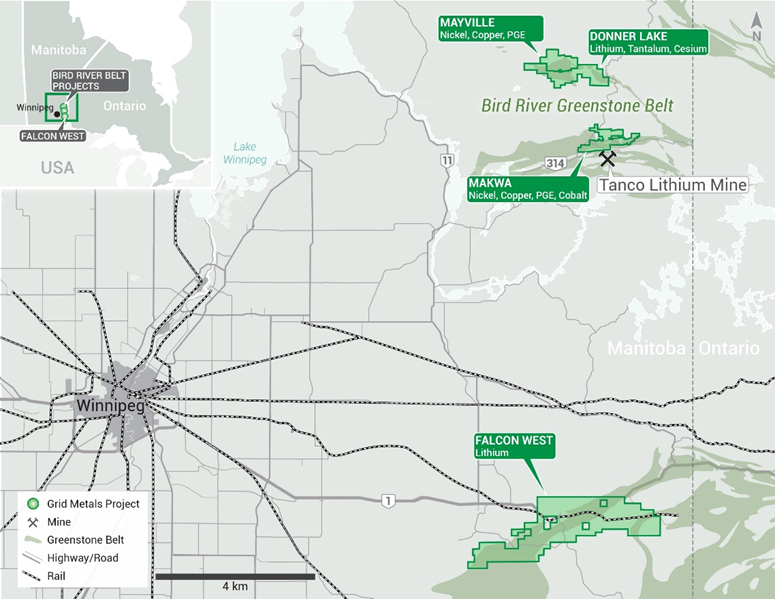 Grid Metals is focused on both lithium and Ni-Cu-PGM in the Bird River area approximately 150 km north east of Winnipeg Manitoba. In addition to activity at Donner Lake the Company has a PEA stage Ni-Cu-PGM-Co project (Makwa-Mayville) undergoing exploration and development activity. The projects are in the traditional territory of the Sagkeeng First Nation.