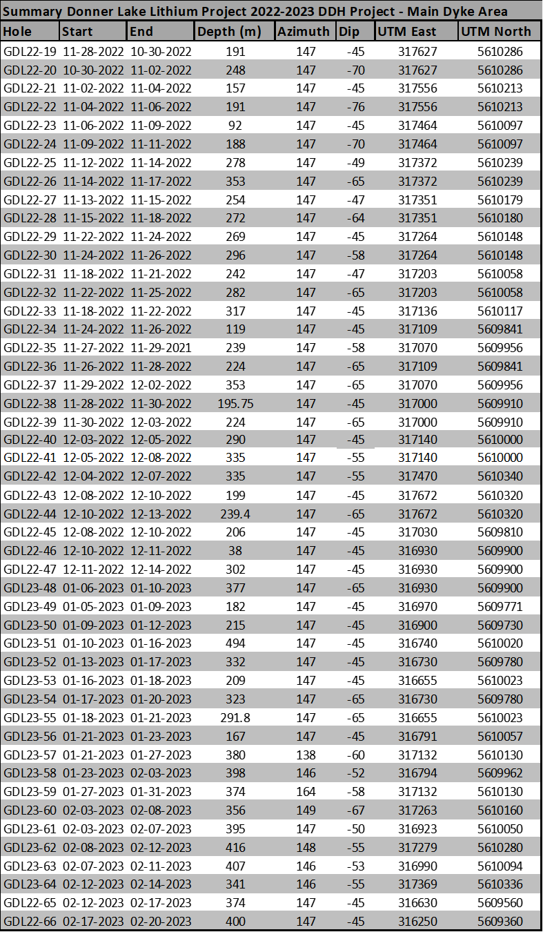 TORONTO, ON, February 22, 2023 (Newswire.com) - ) (the "Company") today reported results from an additional 12 holes at its Donner Lake Lithium Property (the "Property"), located 150 km northeast of Winnipeg Manitoba. The drilling is part of the maiden 43-101 compliant resource delineation program at Donner Lake. The current phase of drilling at the Main Dyke has now been completed.